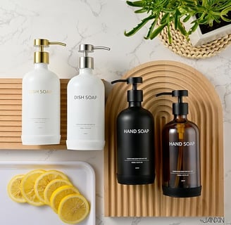 Your bathroom or bedside table can feel like a boutique hotel with just a few upgrades. Opt for beautifully packaged hand soap, lotion, or body oil in neutral containers. Or splurge on a name brand bottle once and refill with cheaper scents you like. Display them on a small tray or with a folded hand towel for a complete look.
